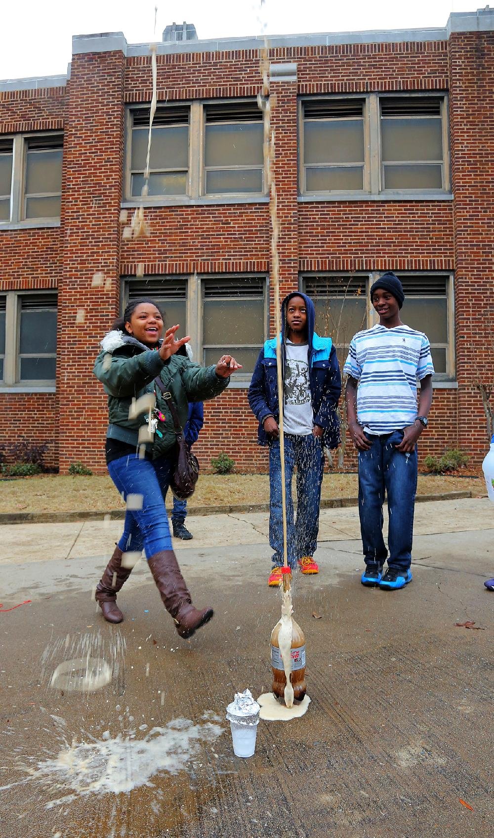 Arkansas Democrat-Gazette/STEPHEN B. THORNTON --01/12/15-- Dunbar Magnet Middle School sixth grader Serenity Robinson, left, jokingly reaches for a shooting stream of diet cola as classmates William Wilson and Desmond McDaniel, right, watch during a science experiment outside their school Monday in Little Rock. The experiment with Diet Coke and Mentos candies was to help illustrate a lesson on volcanic eruptions.